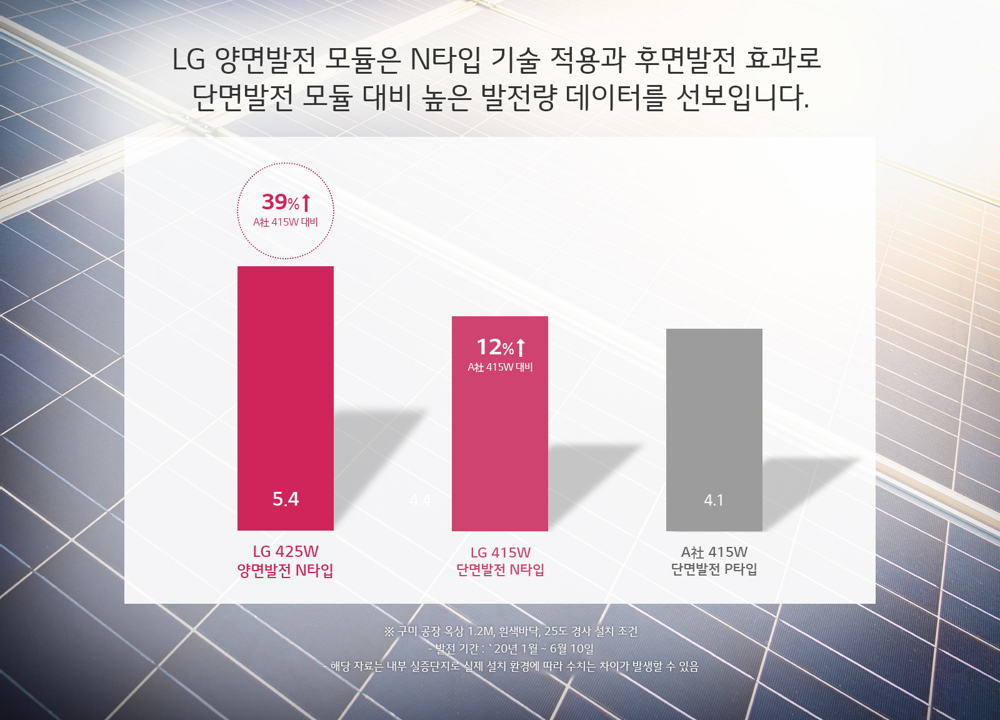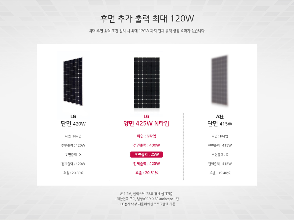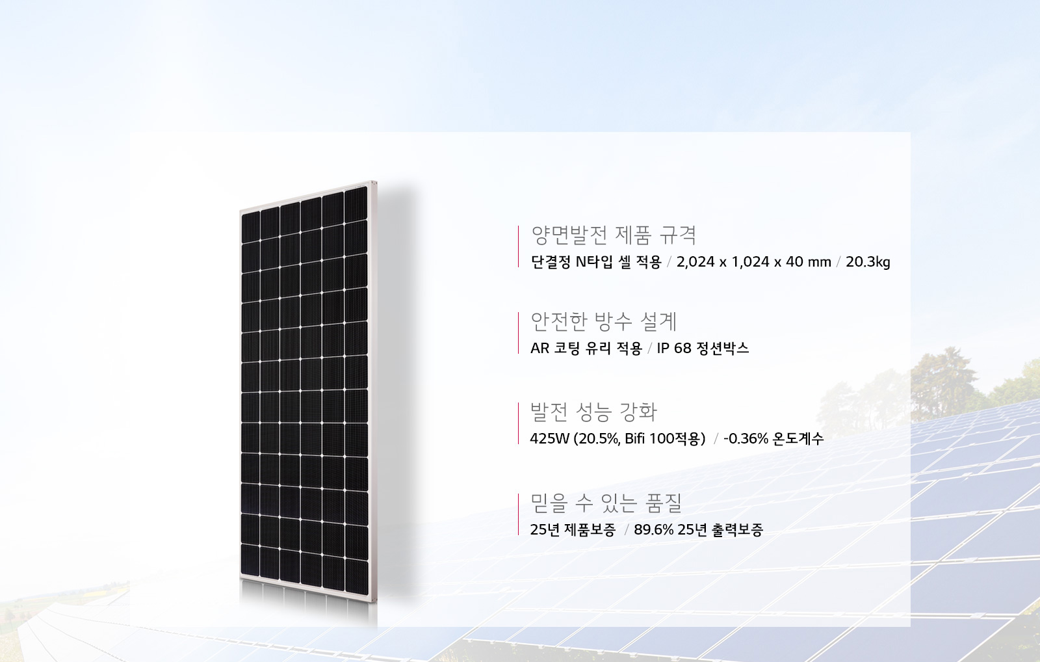 통합 Solution 제공으로 최고의 신뢰성을 보증하는 LG전자 ESS UPS & STS LIGHTING ESS ESS SOLAR COOLING RAILROAD 양면모듈 USP SOLAR 양면모듈 USP 제조사 LG전자 제품명 LG425N2T-V5 용량 425W (전면출력 400W + 후면출력 25W) 효율 20.51%